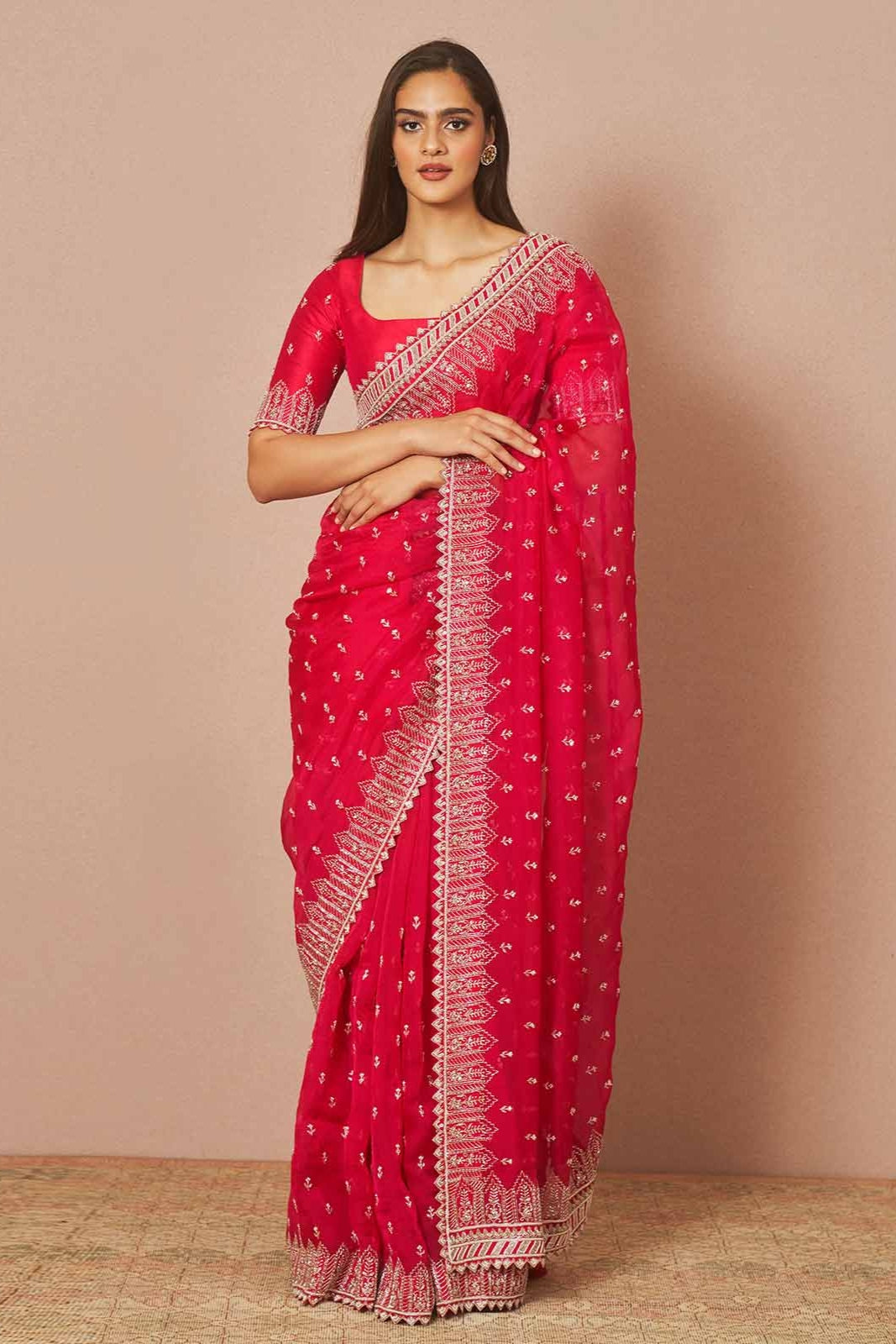 Cherry red Avalon is an organza saree set adorned with all over Chitta embroidery with a heavy border embroidered with cutdana.