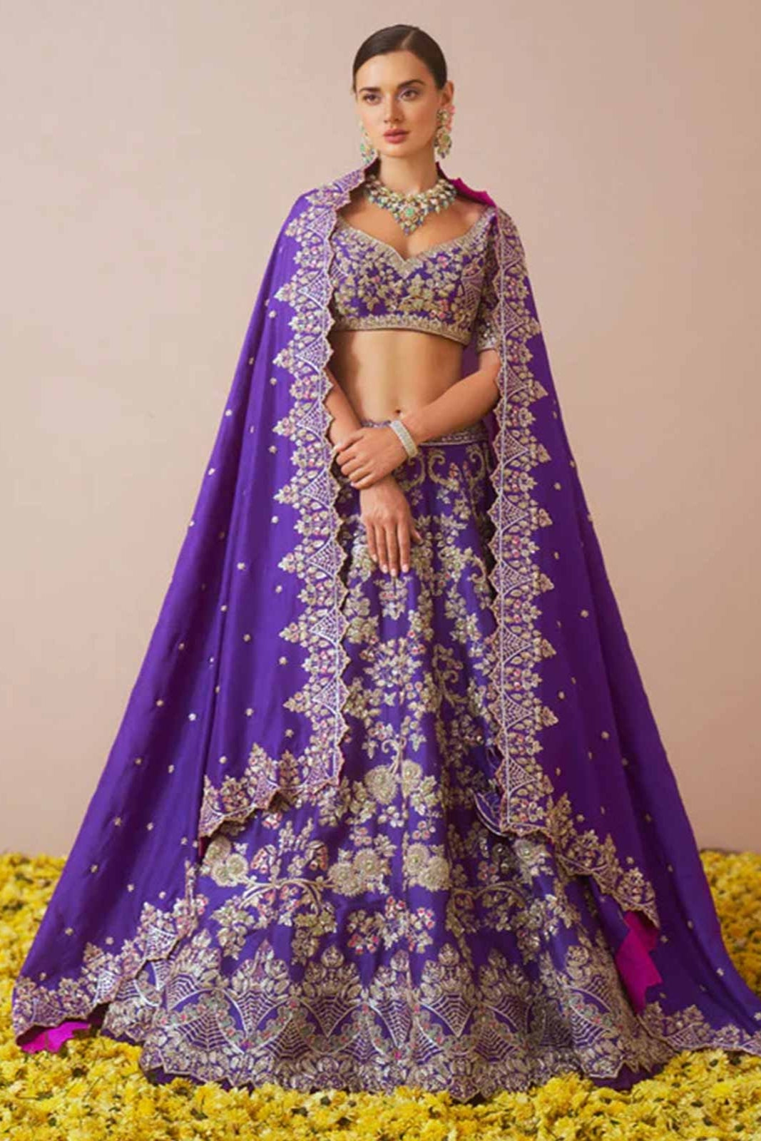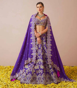 With hues straight from heaven our purple 'Ayeleen' lehenga set is a boon from above. Made with rawsilk in a purple hue and embroidered work this lehenga set is sure to make you fall in love again.