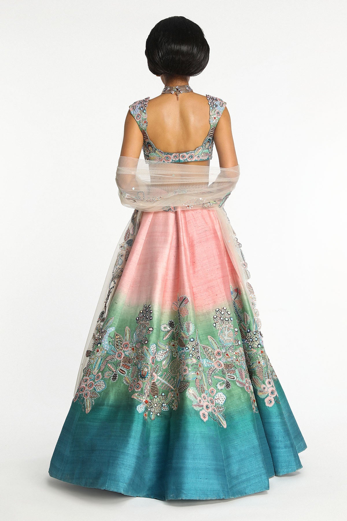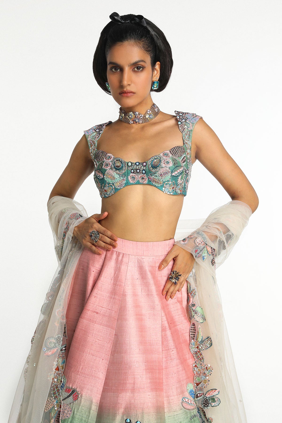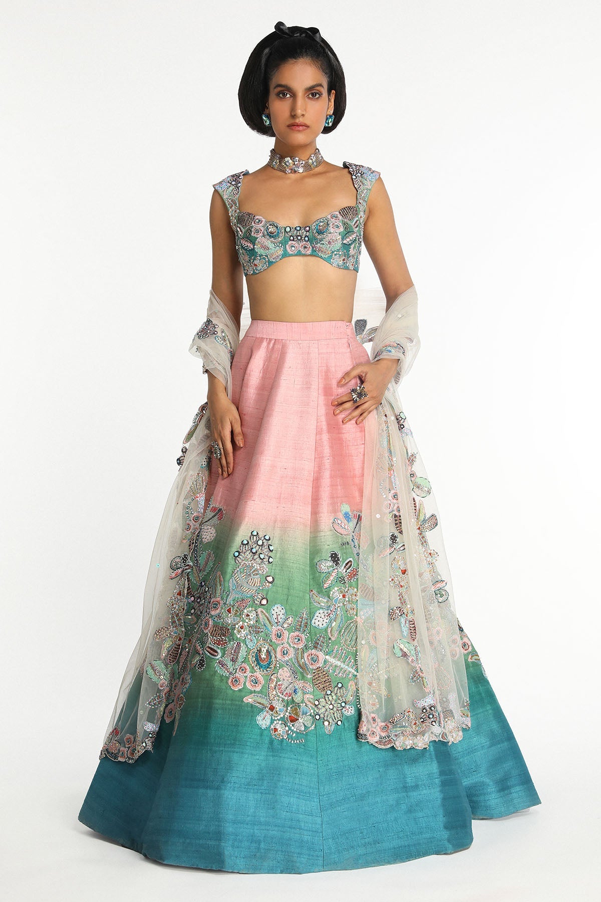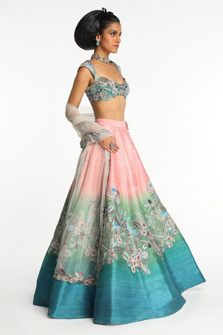 Kinfolk cyan blue applique embellished raw silk lehenga, blouse & tulle dupatta