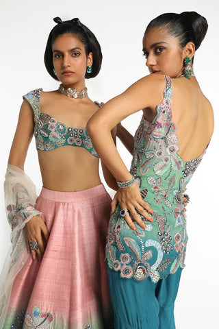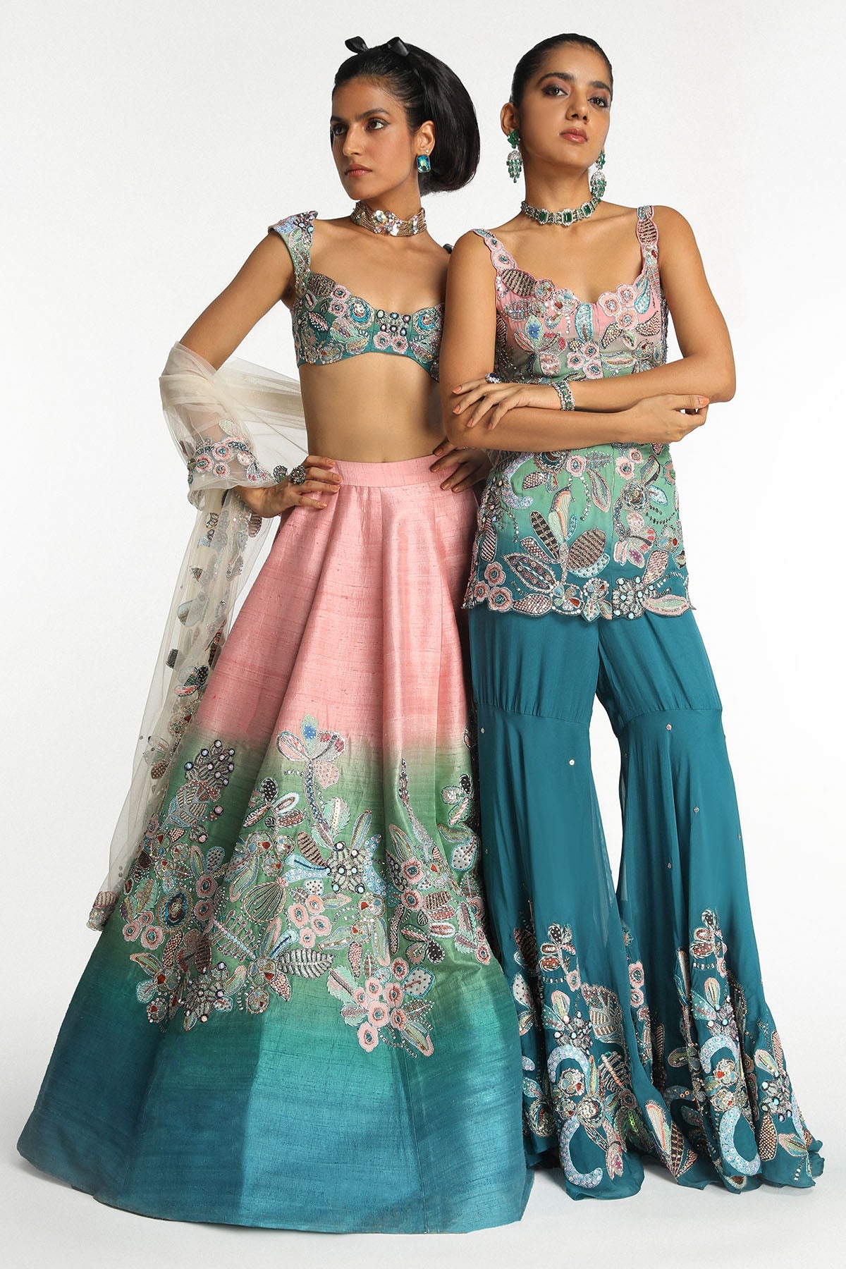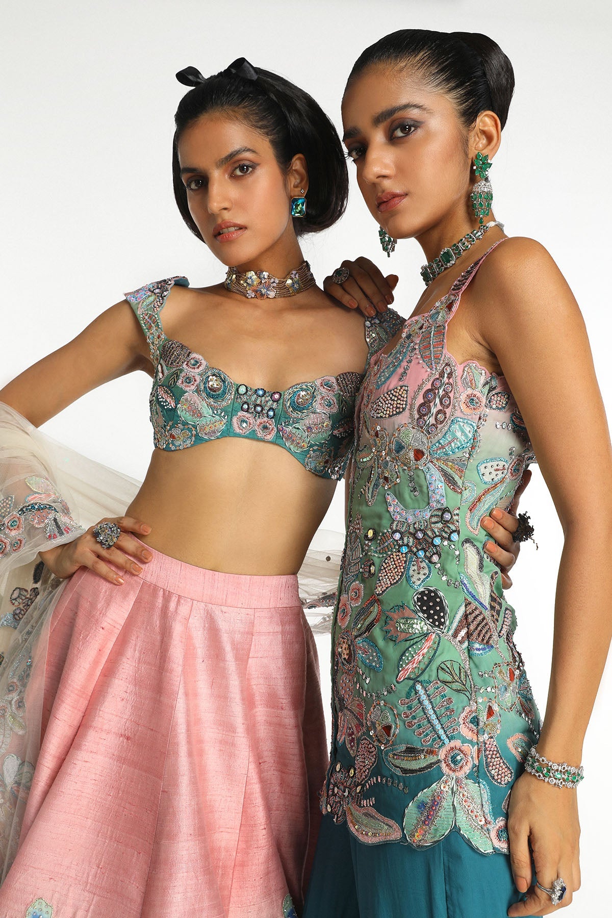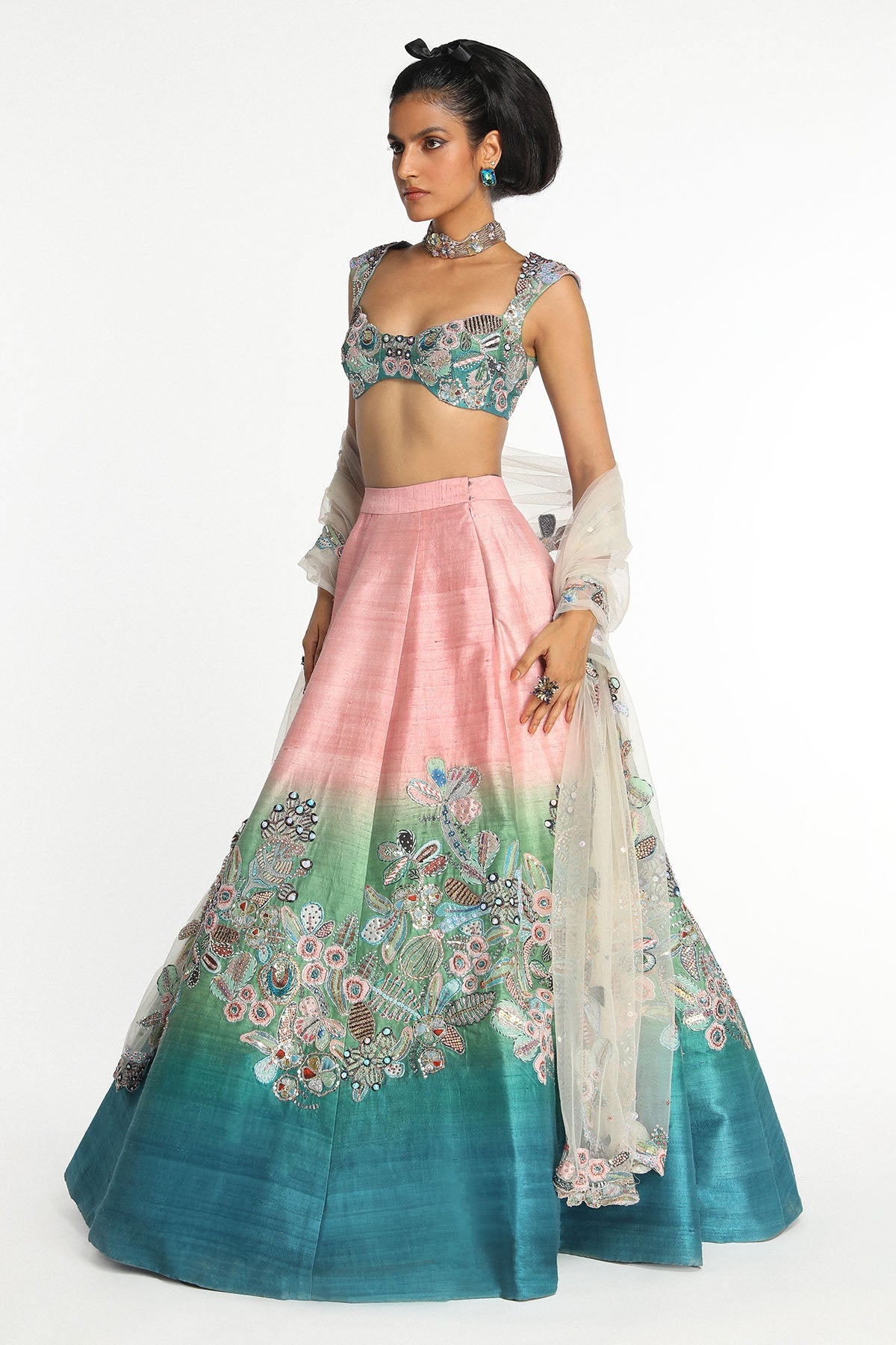 Kinfolk cyan blue applique embellished raw silk lehenga, blouse & tulle dupatta