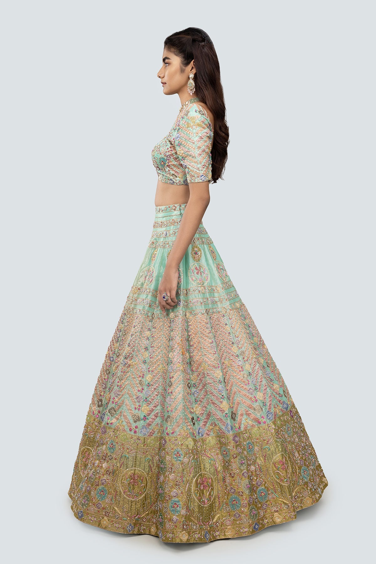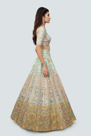 Multicoloured embellised heavy kali tissue lehenga with blouse and net dupatta with border.