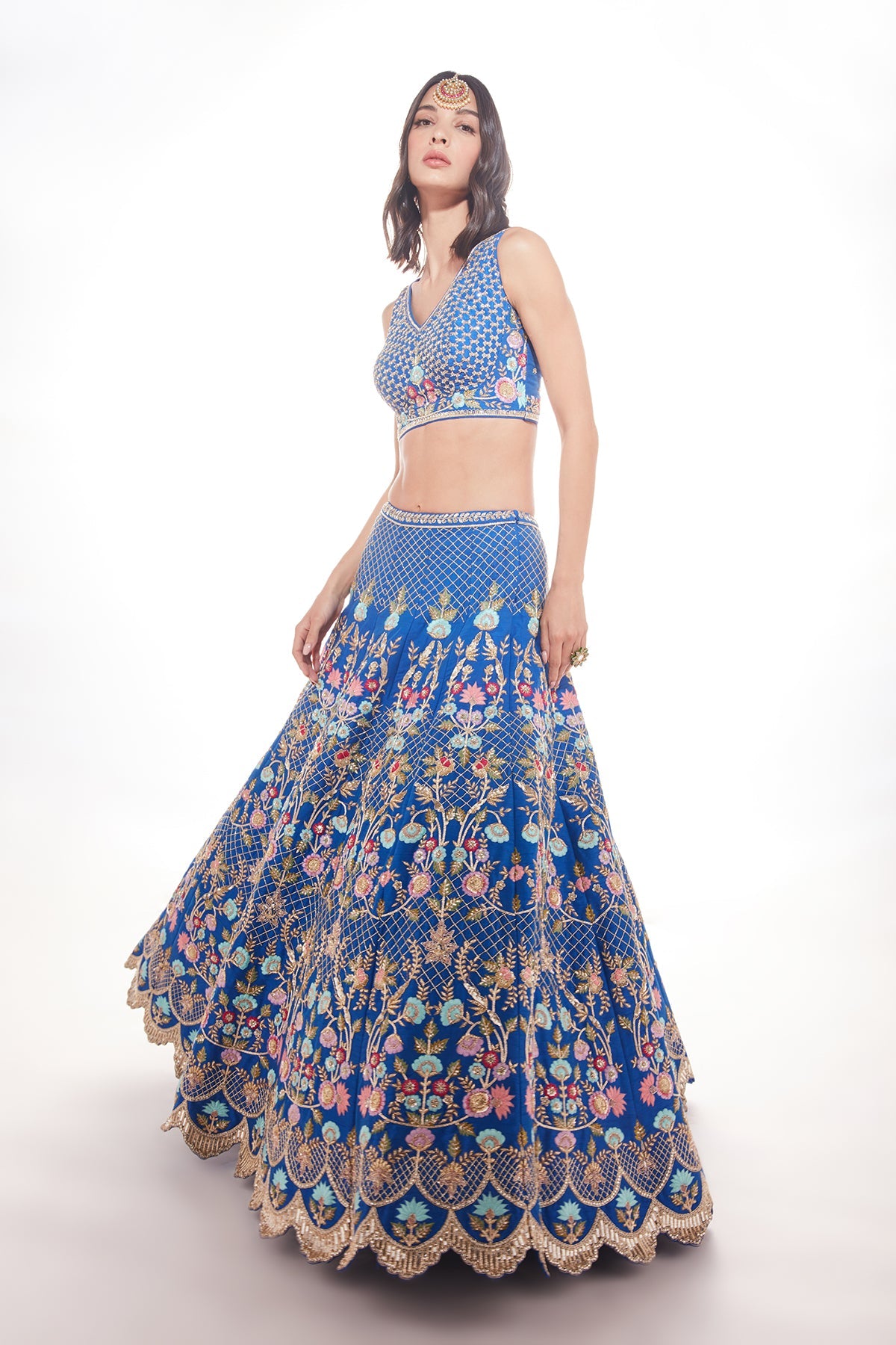 Silk hand embroidered lehenga with zardozi and Resham work paired with matching blouse and coral net dupatta with floral border
