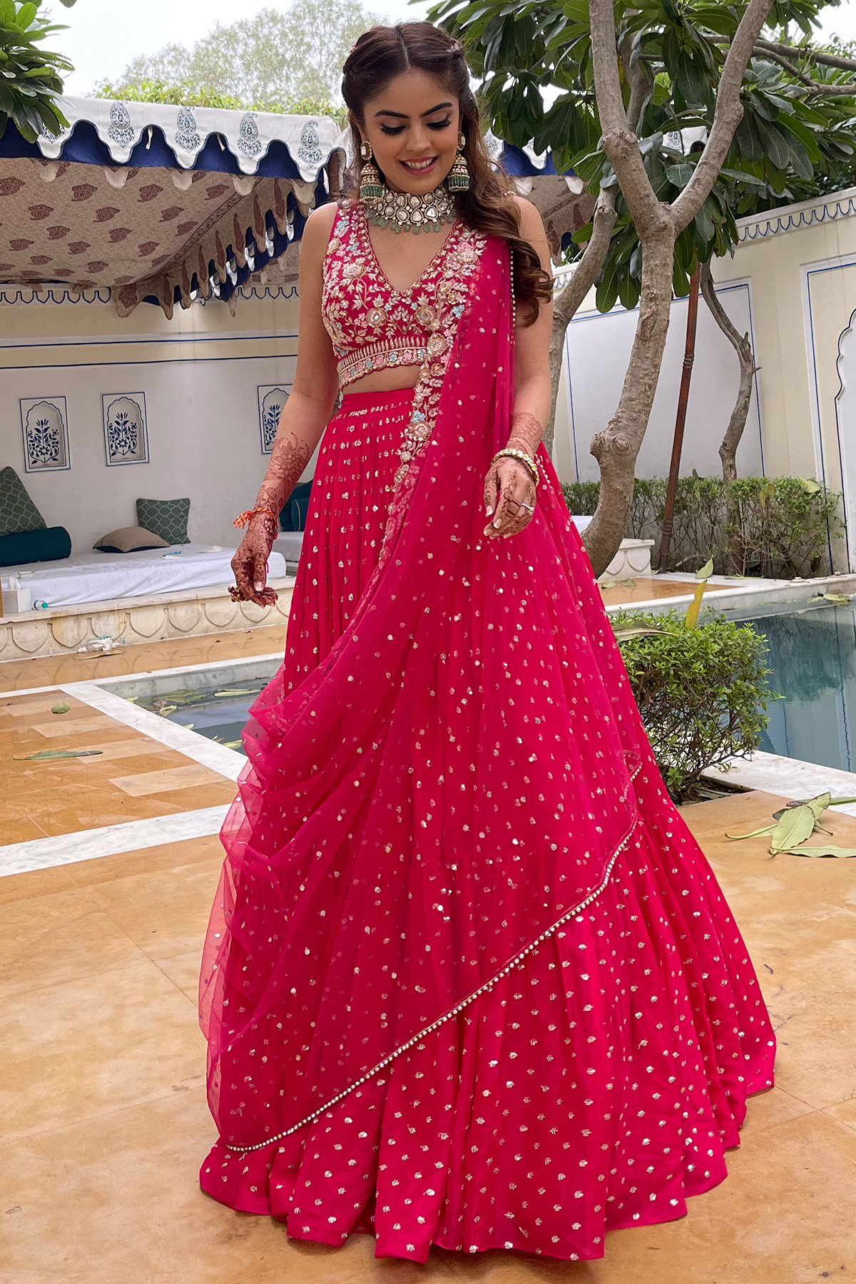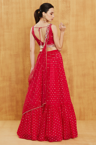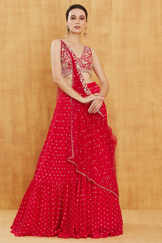 Flared skirt paired, zardozi embellished blouse & tulle pre draped dupatta with embroidered border