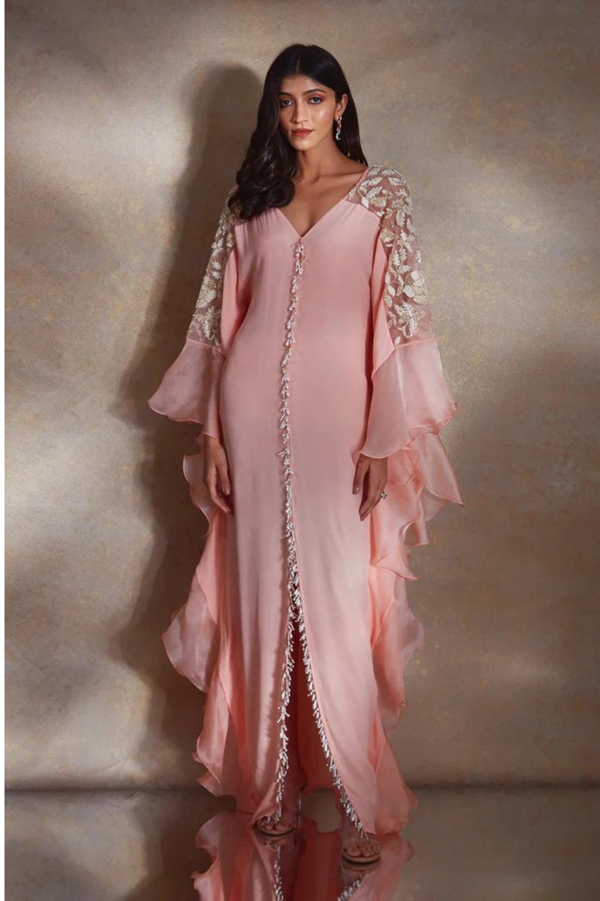 Peach crepe kaftan with organza ruffles featuring net hand embellished shoulder panels with ivory camellia florals & pearl drops on the front and slit