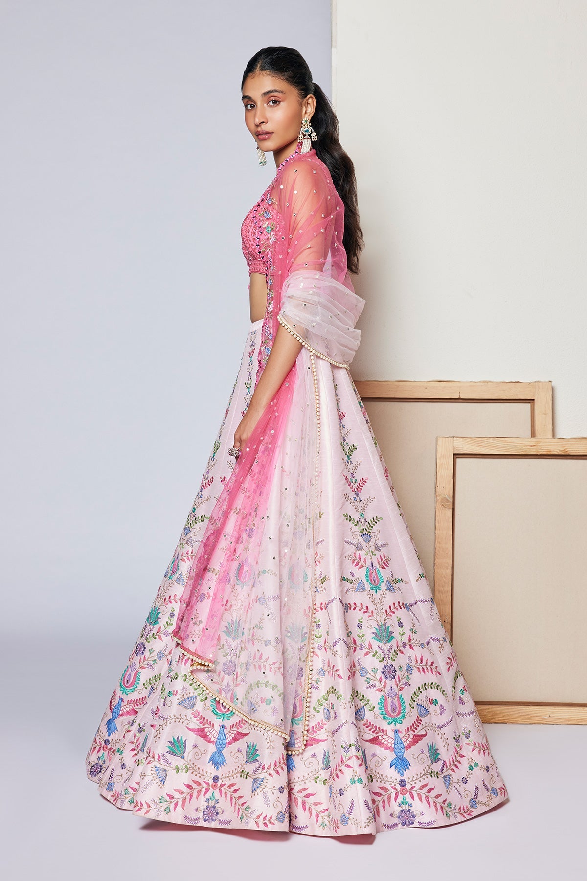 Silk Based Multi-Hued Thread Embroidered Lehenga Paired With Matching Bralette And Tulle Dupatta