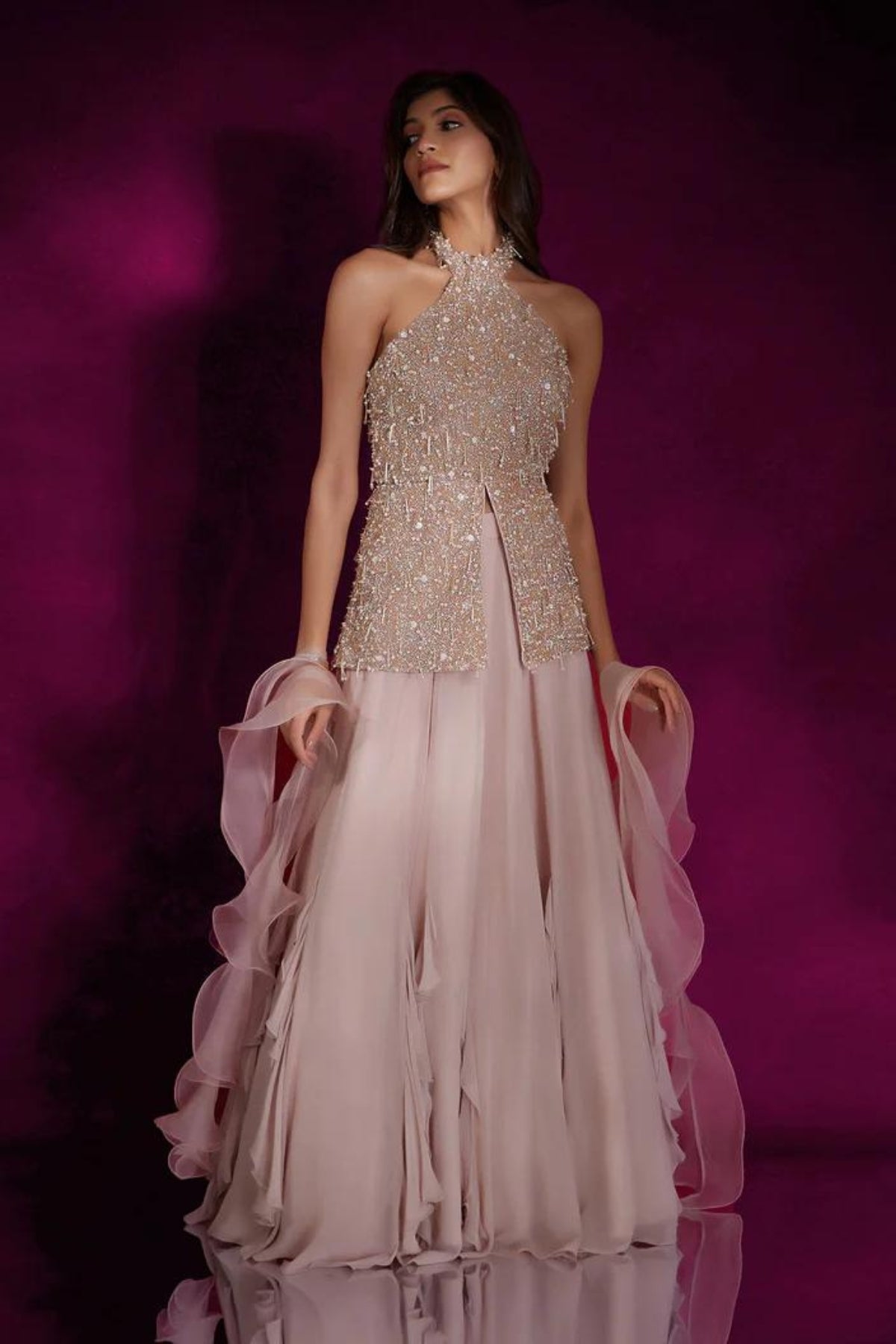 Dusty pink high neck peplum top heavily hand embellished with ivory pearls & silver glass beads and tassels, paired with a georgette lehenga with ruffles & an organza ruffle dupatta