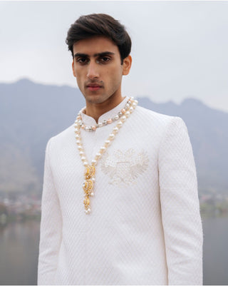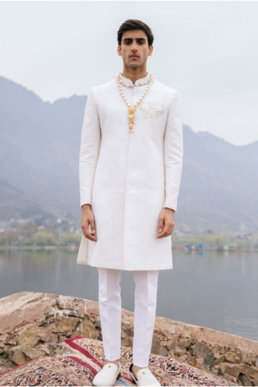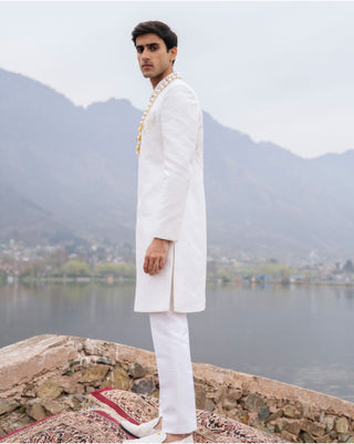 - PEARL WHITE, COLLARED SHERWANI WITH INTRICATE IVORY THREADWORK DETAILS AND STYLED WITH A PAIR OF RAW SILK PANTS.