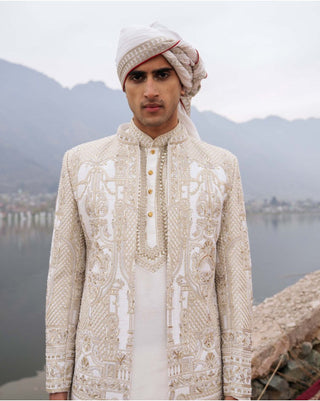 • IVORY, COLLARED, OPEN-FRONT SHERWANI WITH INTRICATE REGAL IN GOLDEN THREADWORK DETAILS, STYLED WITH A PAIR OF RAW SILK KURTA, PANTS AND A SAFA.