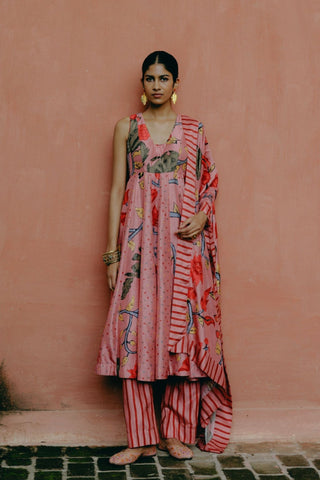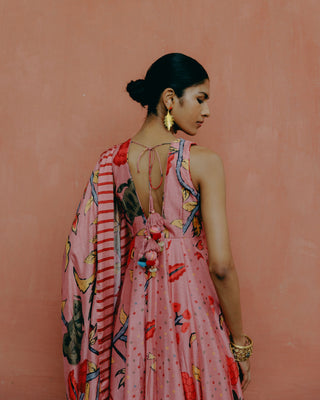 Featuring a dusty rose mix print anarkali in Dupion silk. It is paired with printed pants and mix print dupatta.