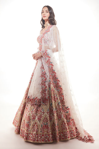 Ivory rawsilk  lehenga with very fine multi hued resham embroiderey with the touch of sequins and glass beads paired with matching blouse and organza dupatta broad embroidered cutwork border