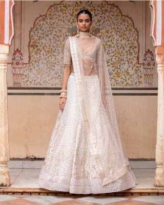 - IVORY-BASED, LIGHT GOLD LEHENGA WITH ARCHITECTURAL MOTIFS IN CHROME APPLIQUE AND IVORY THREADWORK. THE LEHENGA SKIRT IS PAIRED WITH A FULL-SLEEVED, DEEP-NECK, CROPPED BLOUSE HAVING CRYSTAL, SEQUINS AND TASSELS; AND A TULLE DUPATTA WITH BORDER.