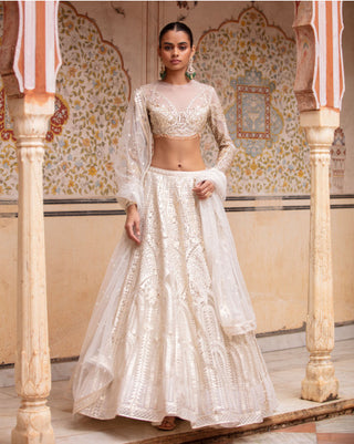 - BEIGE-BASED, LIGHT GOLD LEHENGA WITH ARCHITECTURAL MOTIFS IN CHROME APPLIQUE AND IVORY THREADWORK. THE LEHENGA SKIRT IS PAIRED WITH A FULL-SLEEVED, SHEER NECKLINE, CROPPED BLOUSE HAVING TASSELS; AND A TULLE DUPATTA WITH BORDER.