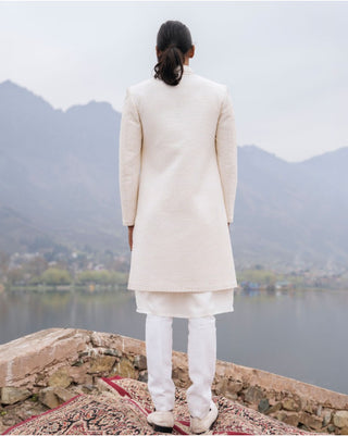 • IVORY, OPEN-FRONT, SHERWANI WITH IVORY THREADWORK DETAILS, TEAMED WITH A RAW SILK KURTA AND PANTS.