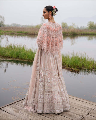 - POWDER PINK-BASED, SILVER LEHENGA WITH INTRICATE THREADWORK FLORAL AND ARCHITECTURAL MOTIFS ADORNED WITH SEQUINS, CRYSTALS AND BEADS. THE LEHENGA IS STYLED WITH A FULL-SLEEVED BLOUSE WITH TASSEL DETAILS, A BORDERED TULLE DUPATTA WITH FEATHERS