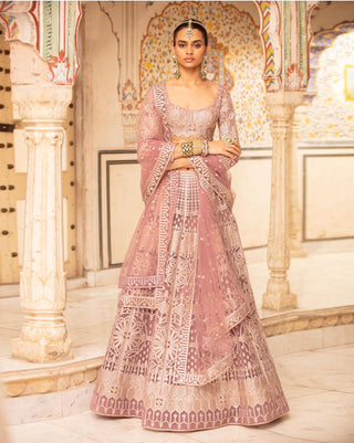 - ROSE QUARTZ PINK, LIGHT GOLD LEHENGA WITH GEOMETRIC MOTIFS IN CHROME APPLIQUE AND IVORY THREADWORK. THE LEHENGA SKIRT IS PAIRED WITH A FULL-SLEEVED, CROPPED BLOUSE HAVING TASSELS; AND A SCALLOP-BORDERED, TULLE DUPATTA.