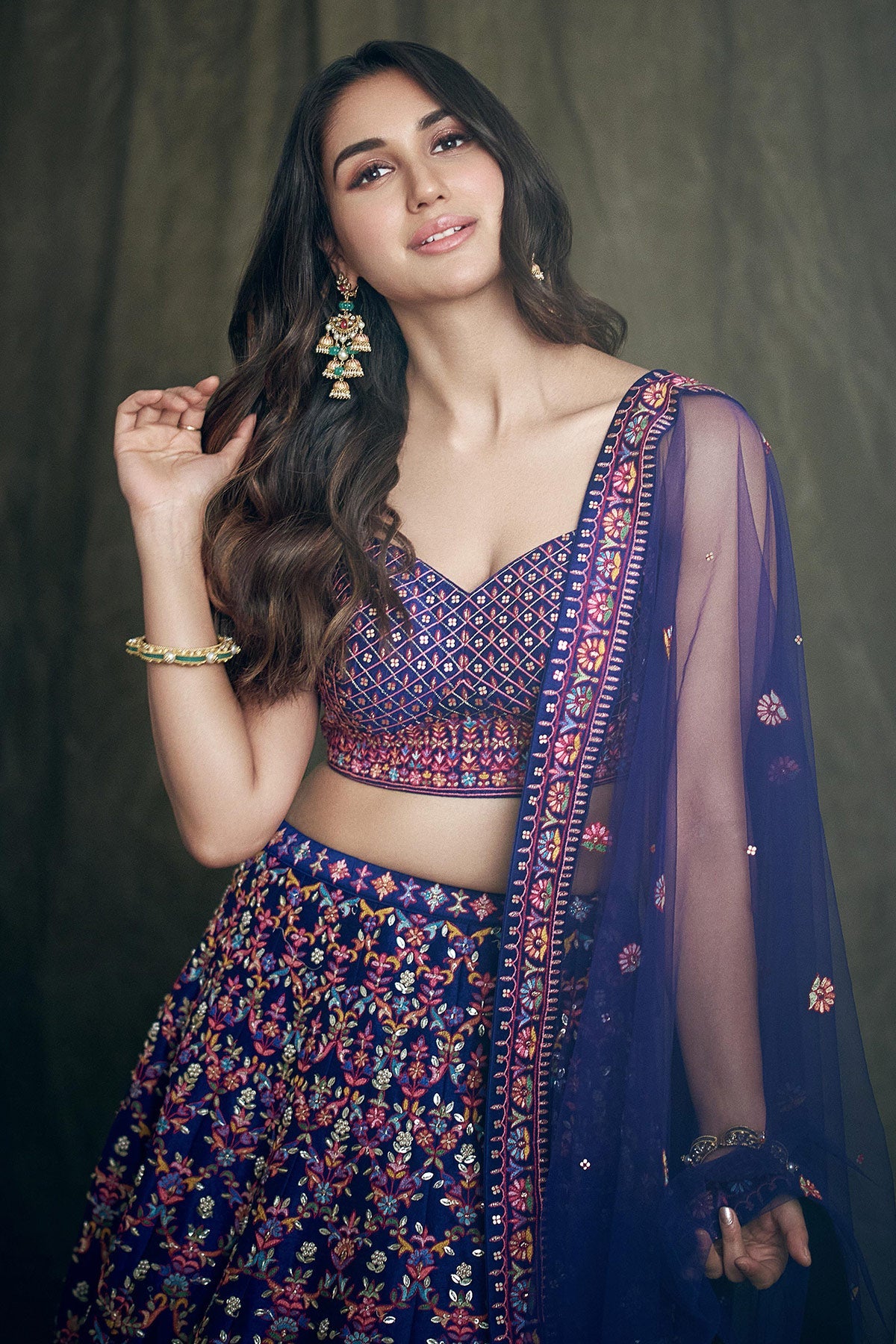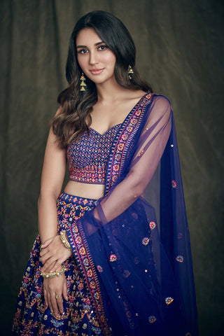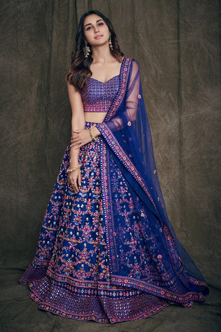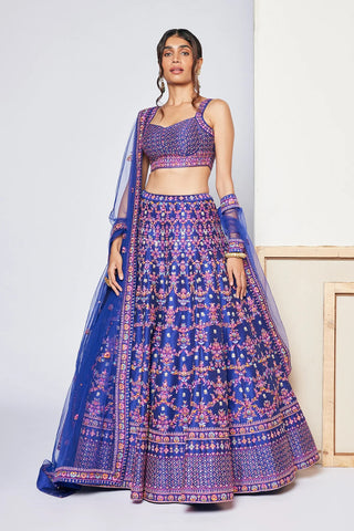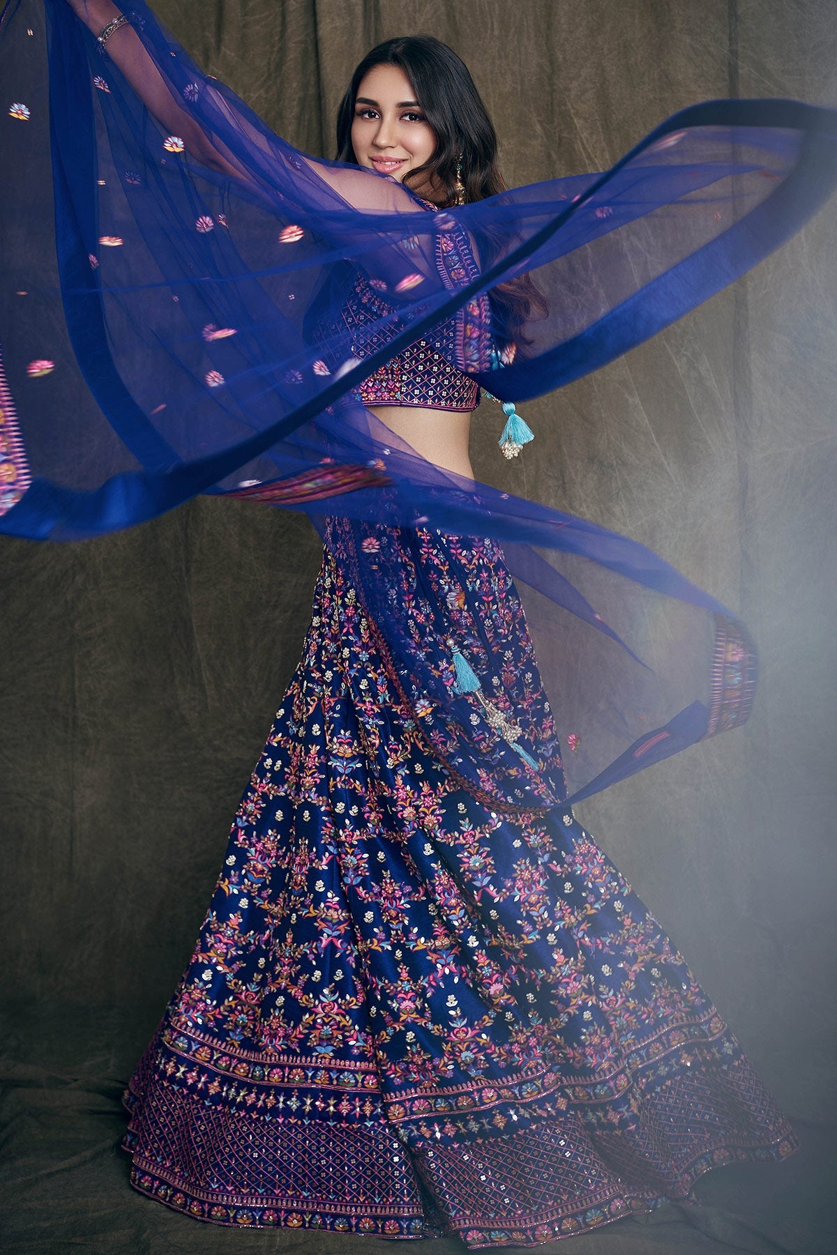 Silk-based multi-hued Kashmiri thread embroidered lehenga with sequence and beads highlight paired with matching  blouse and tulle dupatta
