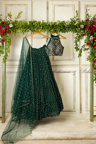 Flared skirt paired halter zardozi embellished blouse & tulle dupatta
