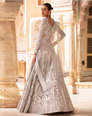 - CLOUD GREY-BASED, SILVER LEHENGA WITH ARCHITECTURAL AND FOLIAGE MOTIFS IN CHROME APPLIQUE AND IVORY THREADWORK DETAILS. THE LEHENGA SKIRT IS PAIRED WITH A FULL-SLEEVED, CROPPED BLOUSE HAVING TASSELS; AND A TULLE DUPATTA WITH BORDER.