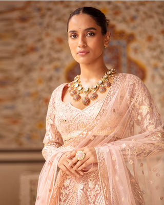 - POWDER PINK-BASED, LIGHT GOLD LEHENGA WITH FOLIAGE MOTIFS IN CHROME APPLIQUE. THE LEHENGA SKIRT IS PAIRED WITH A FULL-SLEEVED, CROPPED BLOUSE HAVING TASSELS; AND A TULLE DUPATTA WITH BORDER.