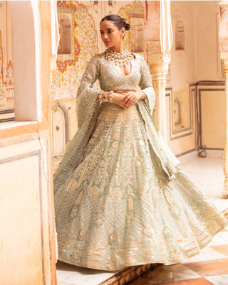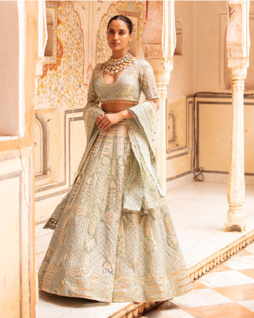 - SAGE GREEN-BASED, LIGHT GOLD LEHENGA WITH ARCHITECTURAL MOTIFS IN CHROME APPLIQUE AND IVORY THREADWORK. THE LEHENGA SKIRT IS PAIRED WITH A HALF-SLEEVED, CROPPED BLOUSE HAVING TASSELS; AND A TULLE DUPATTA WITH BORDER.