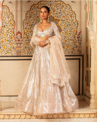 - PEACH-BASED, SILVER LEHENGA WITH ARCHITECTURAL AND FLORAL MOTIFS IN PRINTED CHROME APPLIQUE. THE LEHENGA SKIRT IS PAIRED WITH A FULL-SLEEVED, CROPPED BLOUSE HAVING SEQUINS; AND A CHEVRON-BORDERED, TULLE DUPATTA.