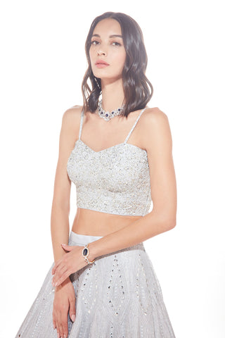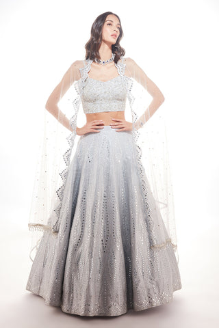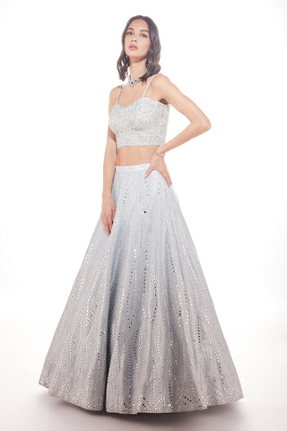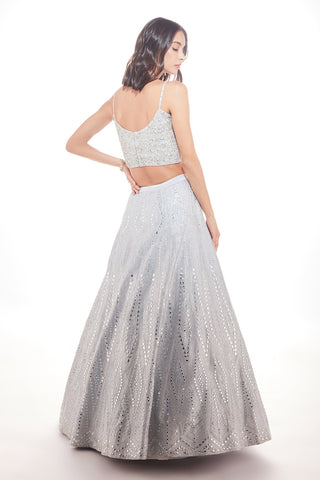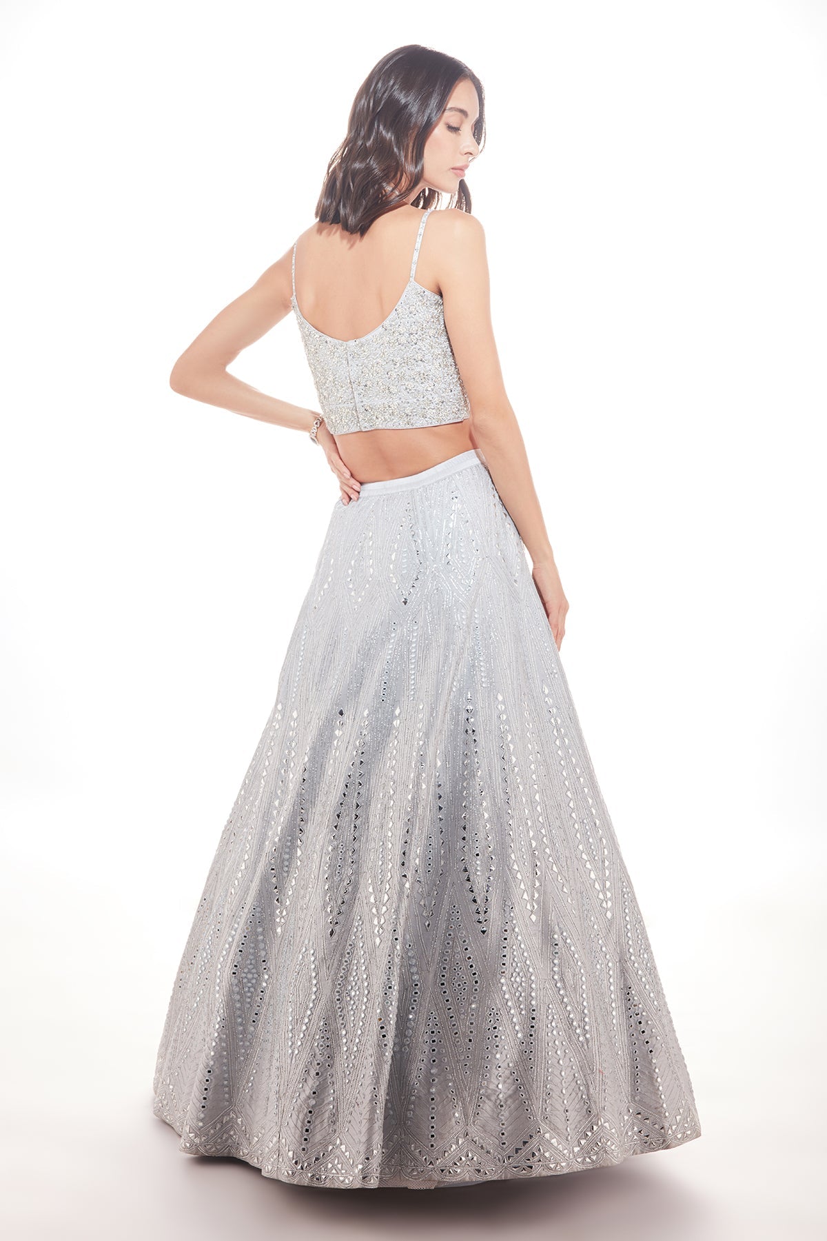 modern and chic skirt with applique and lace work paired with zardozi embellished bralette and net dupatta