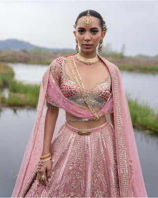 • GERANIUM PINK-BASED, MULTICOLOURED LEHENGA WITH INTRICATE THREADWORK FOLIAGE AND ARCHITECTURAL MOTIFS ADORNED WITH SEQUINS, CRYSTALS, STONES AND BEADS. THE LEHENGA IS STYLED WITH A HALF-SLEEVED BLOUSE WITH BLUE BEADED TASSELS, A TULLE DRAPE AND A BORDERED TULLE DUPATTA WITH TASSELS.