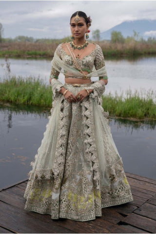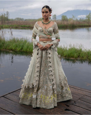 - SAGE GREEN-BASED, MULTICOLOURED LEHENGA WITH INTRICATE THREADWORK REGAL AND ARCHITECTURAL MOTIFS ADORNED WITH SEQUINS, CRYSTALS, STONES AND BEADS. THE LEHENGA IS STYLED WITH A HALF-SLEEVED BLOUSE WITH GREEN BEADED TASSELS, AND A SCALLOP-BORDERED TULLE DUPATTA.