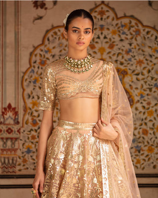 - ENGLISH ROSE PINK-BASED, LIGHT GOLD LEHENGA WITH FLORAL AND FOLIAGE MOTIFS ALONG WITH WORDS 'LOVE' AND 'HOPE' IN PRINTED CHROME APPLIQUE. THE LEHENGA SKIRT IS PAIRED WITH A UNIQUE, HALF-SLEEVED, CROPPED BLOUSE HAVING SEQUINS; AND A TULLE DUPATTA WITH BORDER.