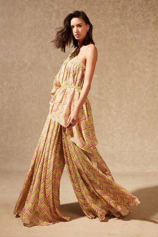 Georgette chevron printed one-shoulder top, with hand-embroidered neckline and waistbelt, paired with flared pants