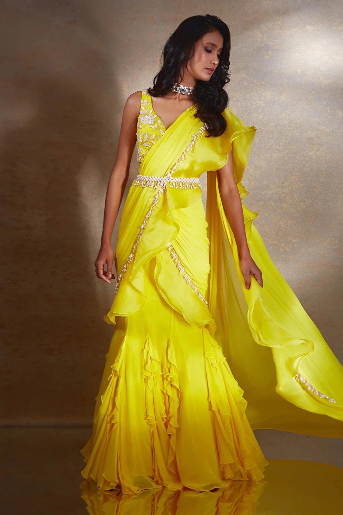 Yellow corset blouse featuring ivory hand embellished camellia florals paired with a fishtail ruffle skirt & georgette & organza pre-sttiched pallu. Worn with a pearl drops belt.