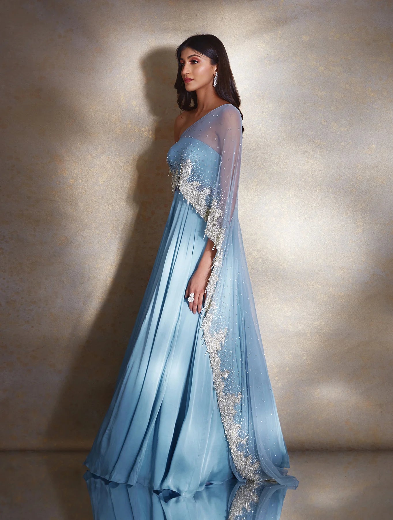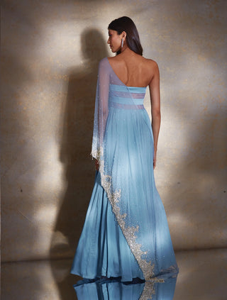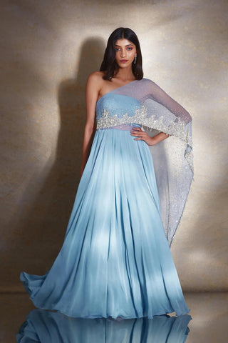 Dusty blue satin georgette tube gown with an attached net heavily hand embellished drape featuring ivory pearls & silver glass beads & tassels