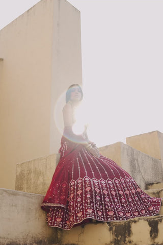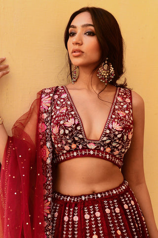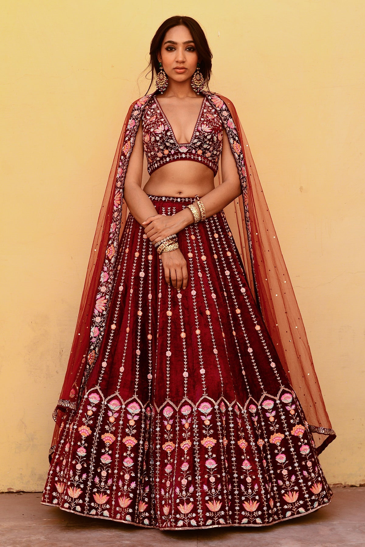Velvet based lehenga finely embroidered with multihued resham, zardosi and glass beads. it is paired with a densely embroidered floral jaal blouse with a zardosi accentured neckline and a tulle dupatta with intricately embroidered floral borders