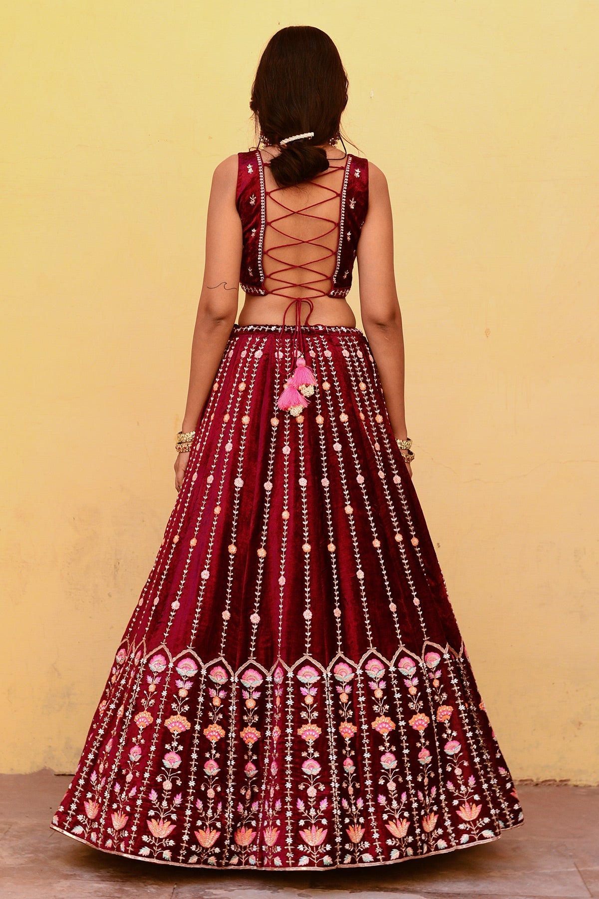PRODUCT HIGHLIGHT: Velvet blouse with zardosi embroidery lined with cotton. Velvet skirt lined with crepe.
