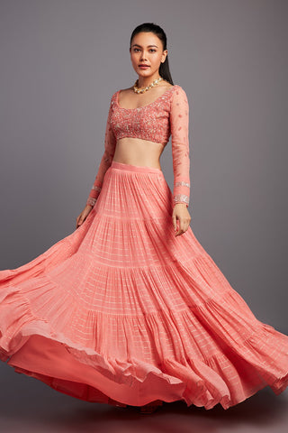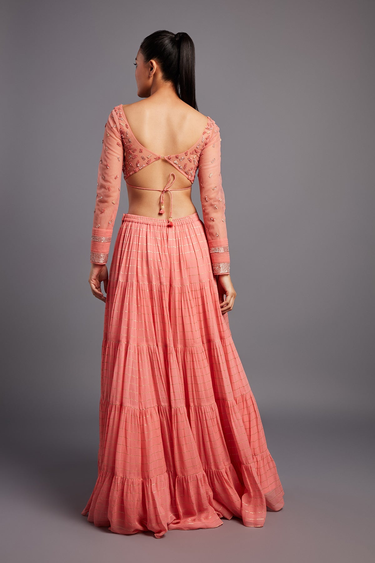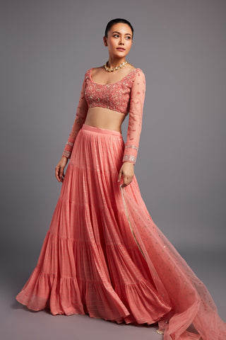 Tiered skirt with sequence embroidery, paired with a sequence embellished sheer full sleeve blouse and tulle dupatta.