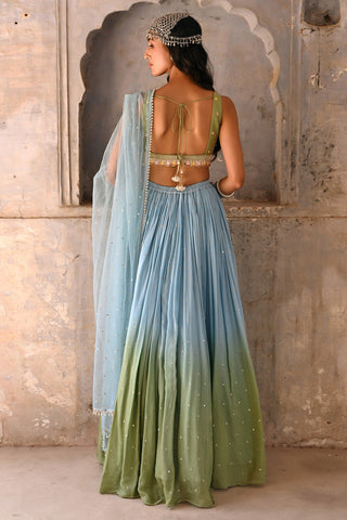 Resham Zardozi And Glassbeads Embroidered Blouse With Shaded Georgette Skirt And Tulle Dupatta