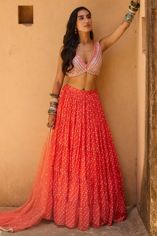 Bandhani Printed Frill Skirt With Mirror And Leather Applique Blouse With Tulle Dupatta