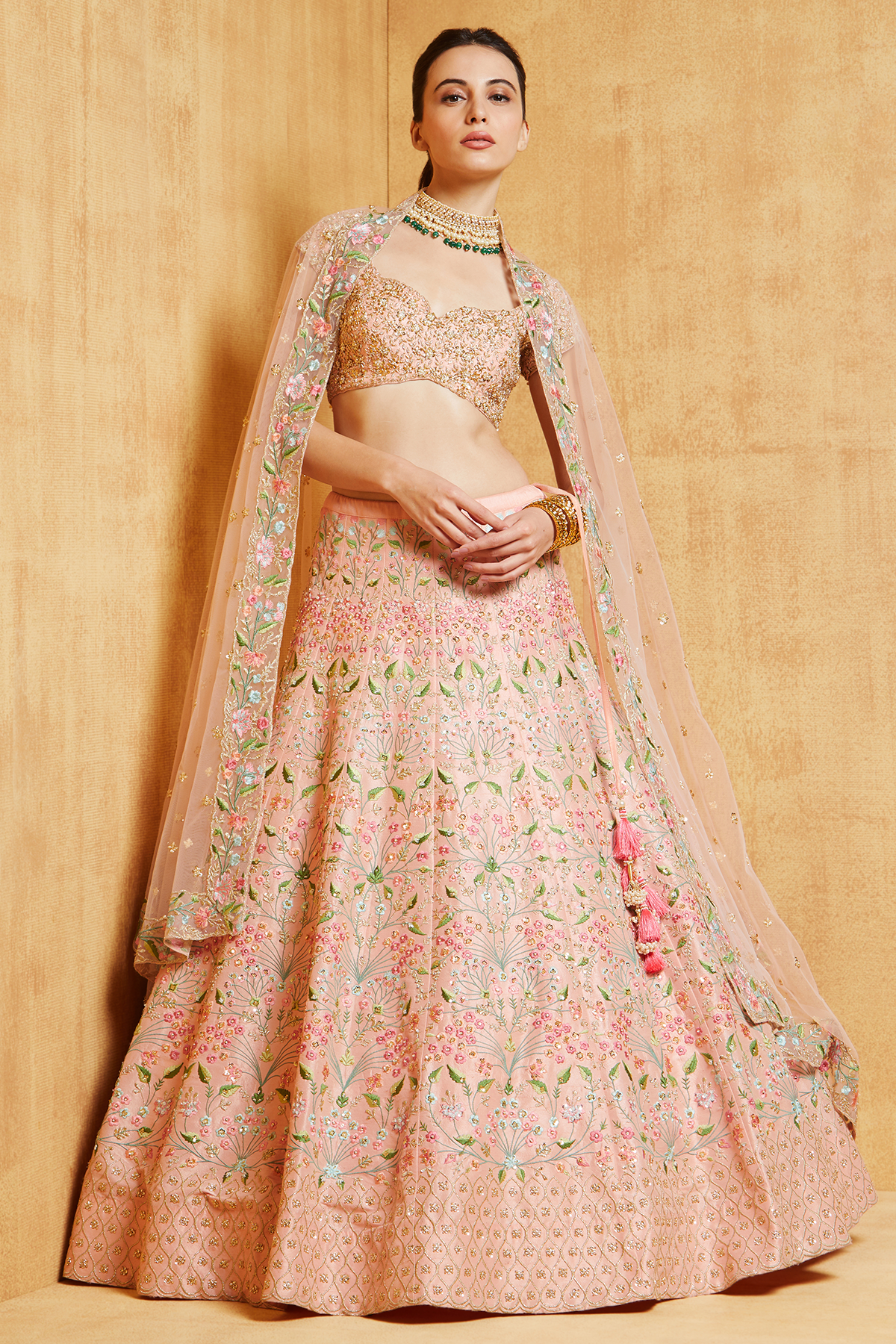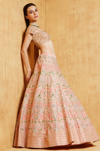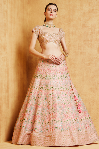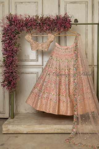 peach dupion lehenga with delicate floral embroidery in the multi-colored thread and sequence highlights paired with zardosi embellished blouse and tulle dupatta with borders
