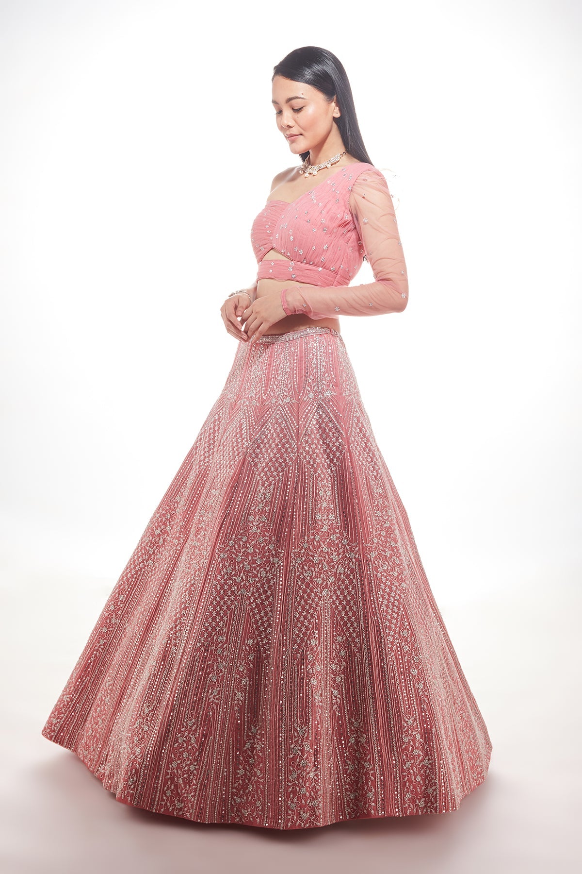 Pink organza lehenga hand-embroidered with fine glass beads and sequence paired with ruched one-shoulder blouse and net dupatta with tassels