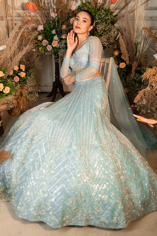 Powder blue flowy organza lehenga with silver glass beads and sequin embroidery fine pleated full sleeve blouse and simple net dupatta. Crep and cotton lining, blouse with back hook and tie up, skirt with hook eye and drawstrings