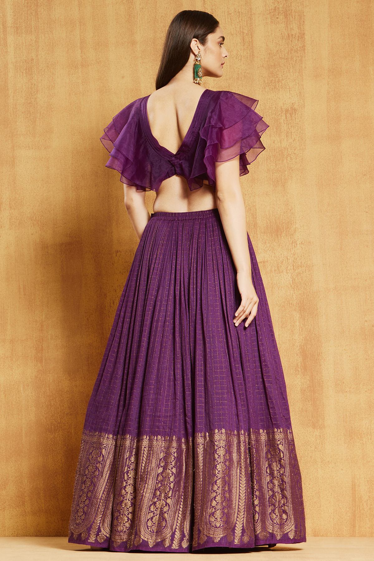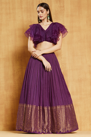 Silk jamewar skirt with zari detailing paired with a ruffle blouse
