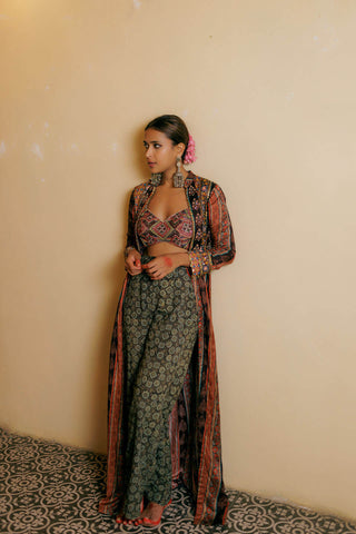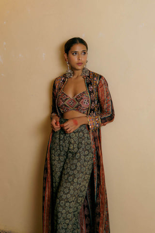 Nandi bead work bustier with ajrakh pallazos teamed with a silk printed cape highlighted with antique sequins
