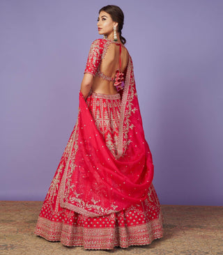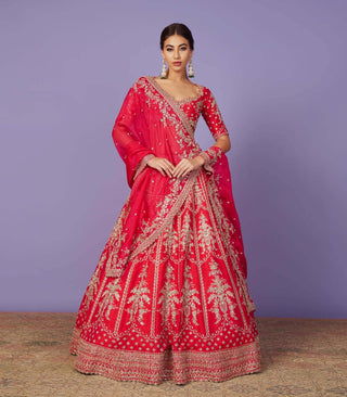 CHERRY RED RAWSILK BOUQUET LEHENGA SET