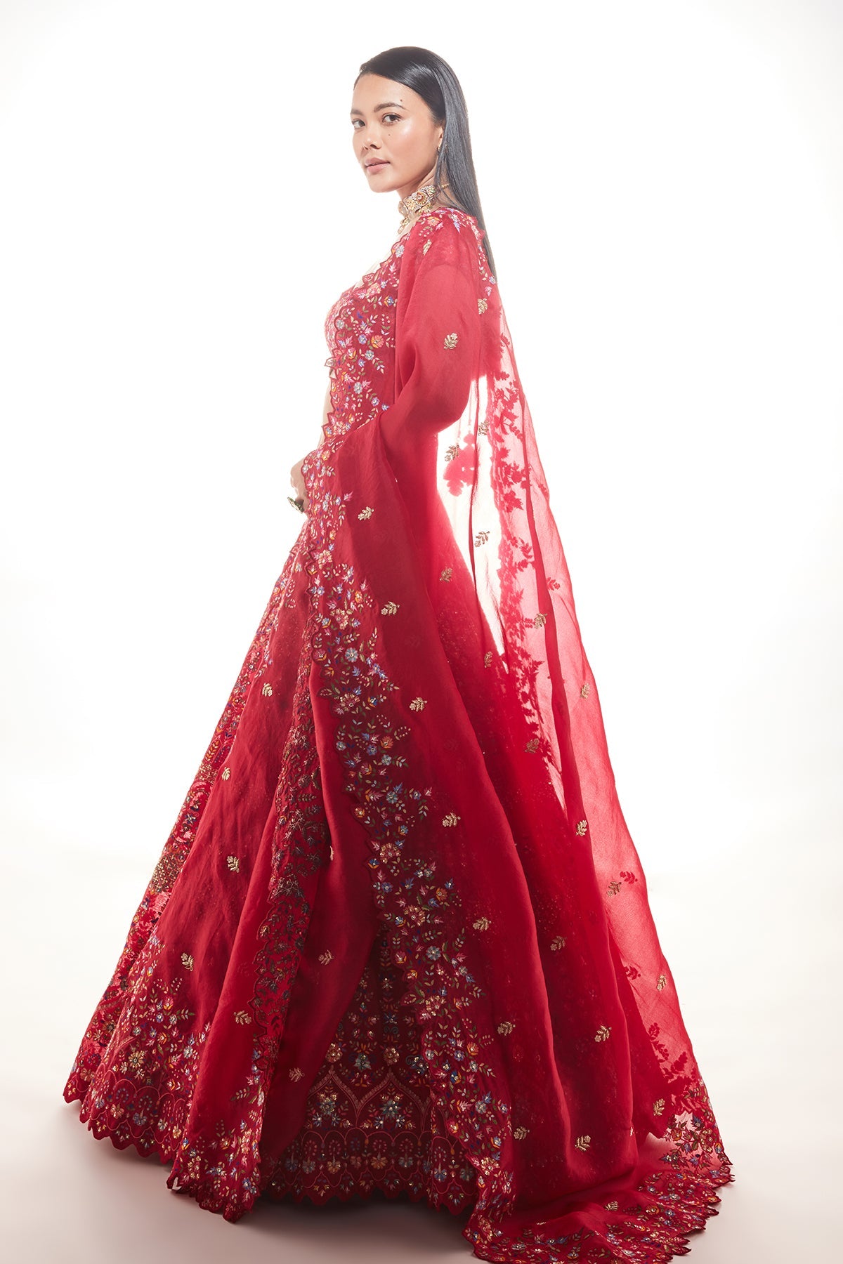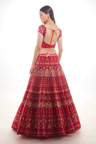 Red organza lehenga with very fine  multi hued resham embroiderey with the touch of sequins and glass beads paired with organza dupatta broad embroidered cutwork border