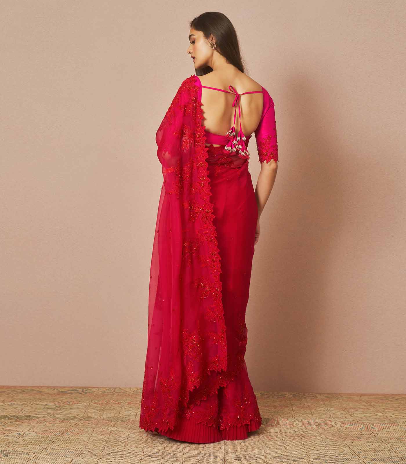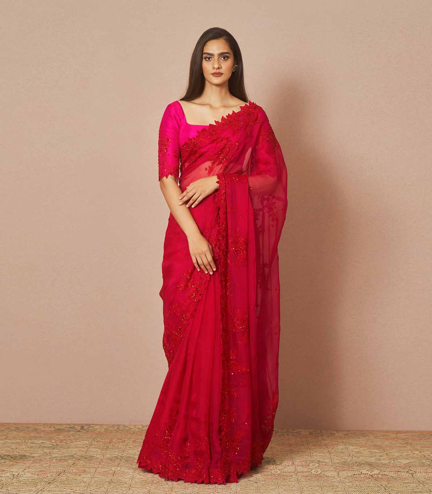 Reina is our signature combination of red tonal shades enhancing cutdana and thread work embroidery on our organza saree set and raw silk blouse.
