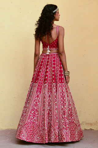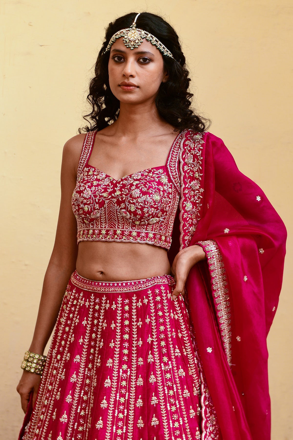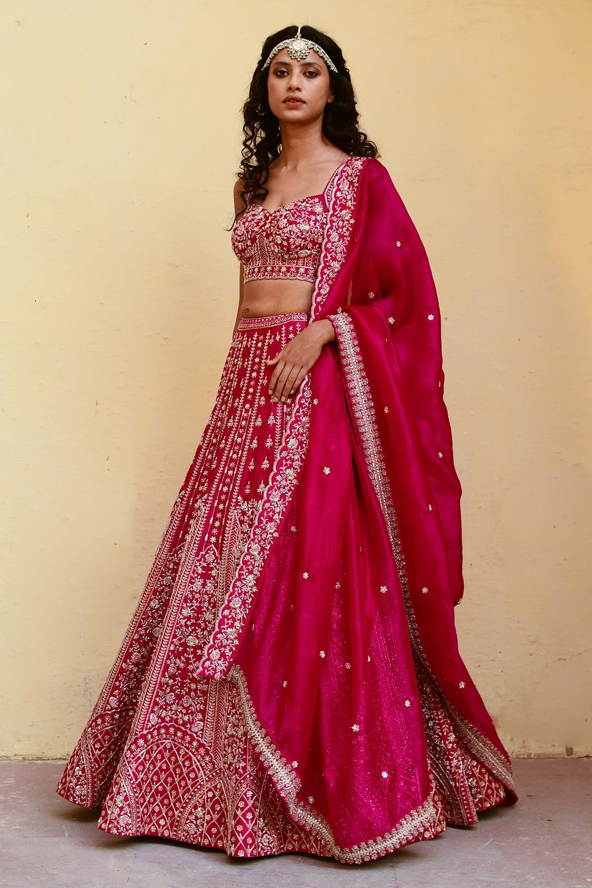 Silk based lehenga exquisitely hand embroidred with aari, zardosi embroidery. it is paired with a matching jaal embroidered blouse and an organza dupatta with floral buttis scattered throughout and intricate floral borders on 3 sides and a scalloped border on one side.