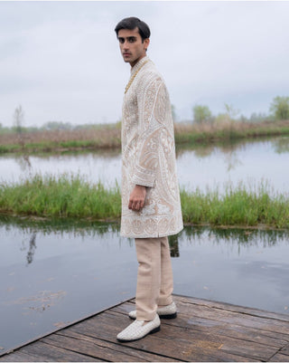 • BEIGE, COLLARED SHERWANI WITH INTRICATE IVORY THREADWORK ON TRADITIONAL MOTIFS, STYLED WITH A PAIR OF RAW SILK PANTS.