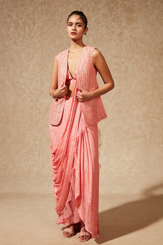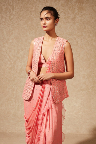 Peach pre draped georgette saree with a silk bustier and embroidered blazer jacket.