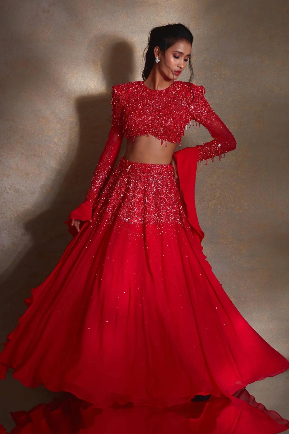 Bright turquoise blue georgette tiered lehenga featuring ivory drops & an attached net draped hand embellished with ivory pearls, glass beads and tassels. Paired with a hand embellished sweetheart blouse featuring hand embellished ivory camellia florals and a tie back.