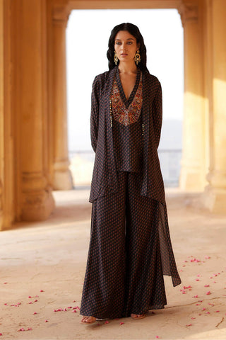 Black short kurta with a hand embroidered patch on the neckline teamed with printed pants and an asymmetrical cape.